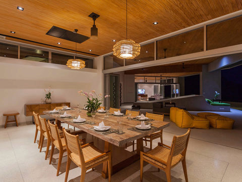 Центральное место в обеденной зале занимает большой дизайнерский стол из деревянного массива. Авторские люстры необычайно гармонично вписаны в интерьер виллы, они украсят ваши вечера своим золотистым светом. За столом с комфортом может разместиться 10 человек. Из обеденной залы также виден океан и залив Панг Нга.